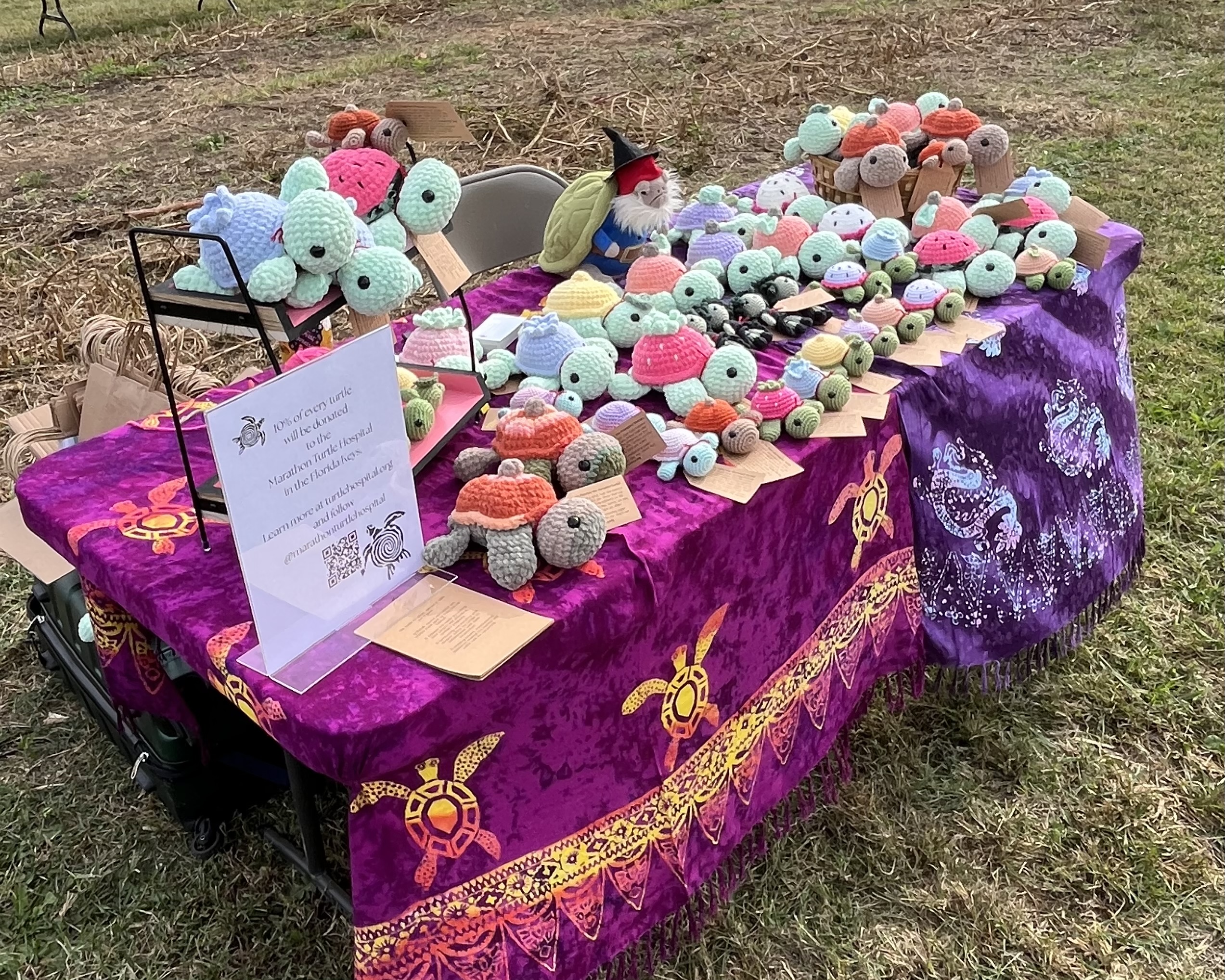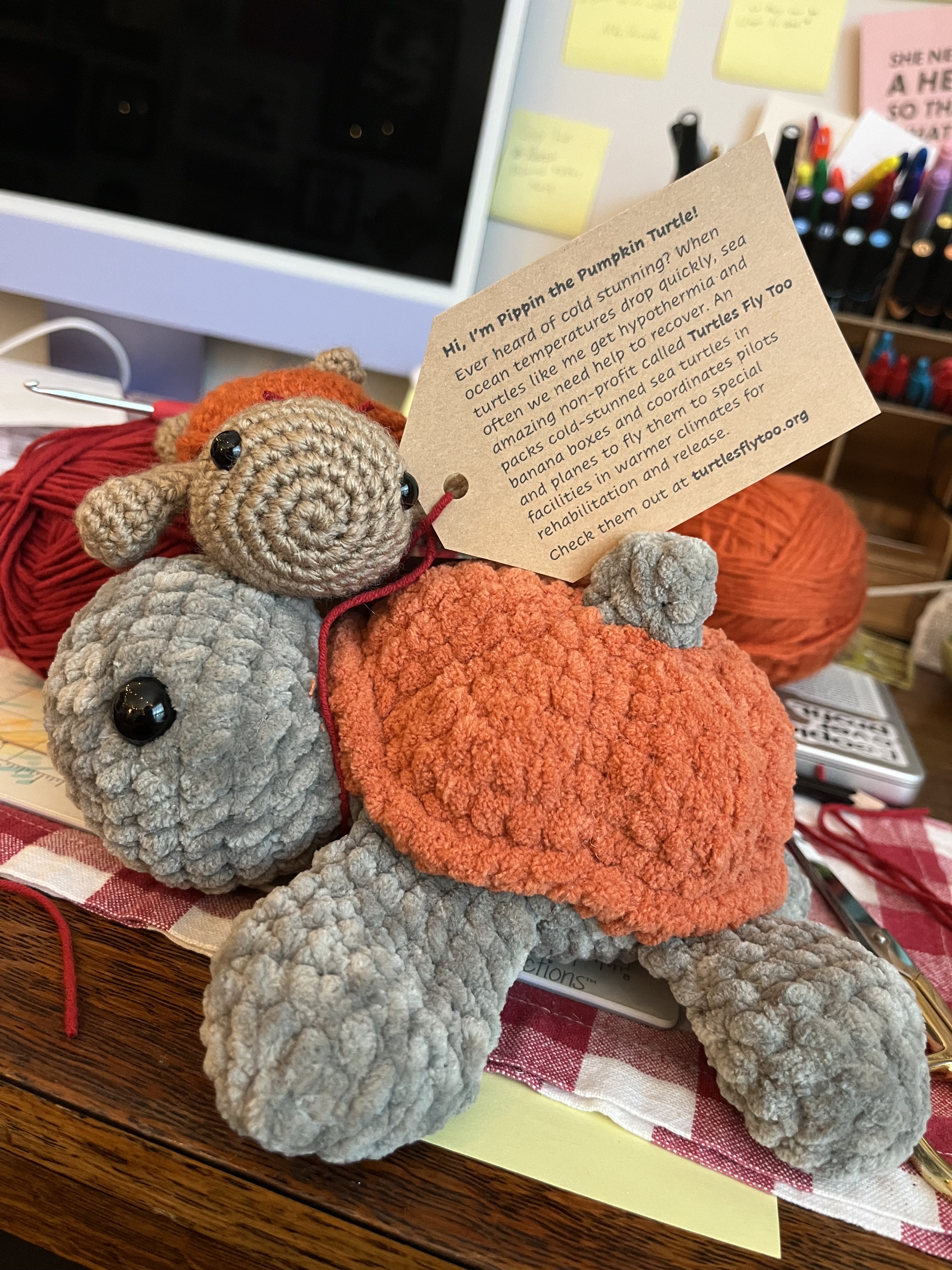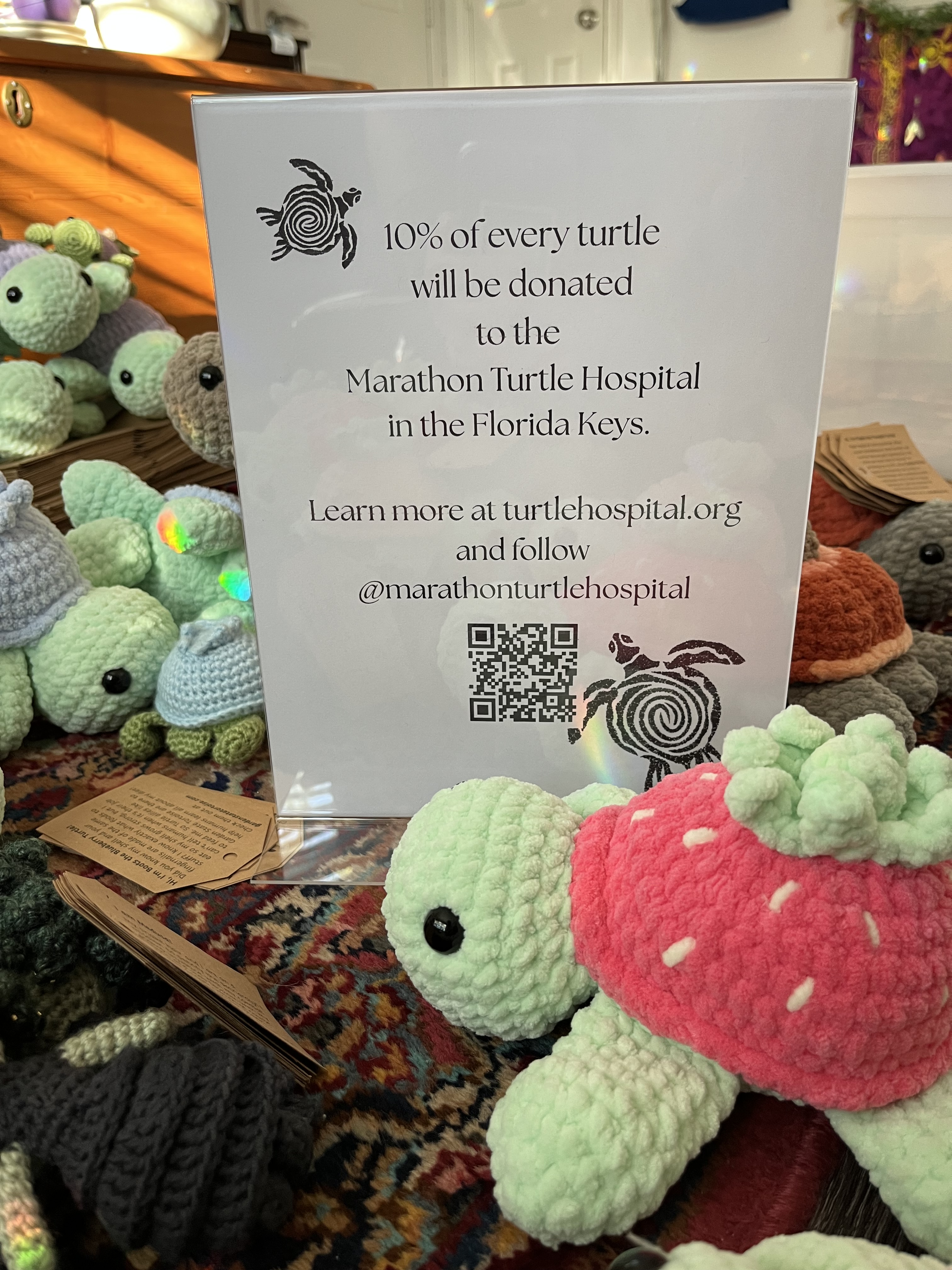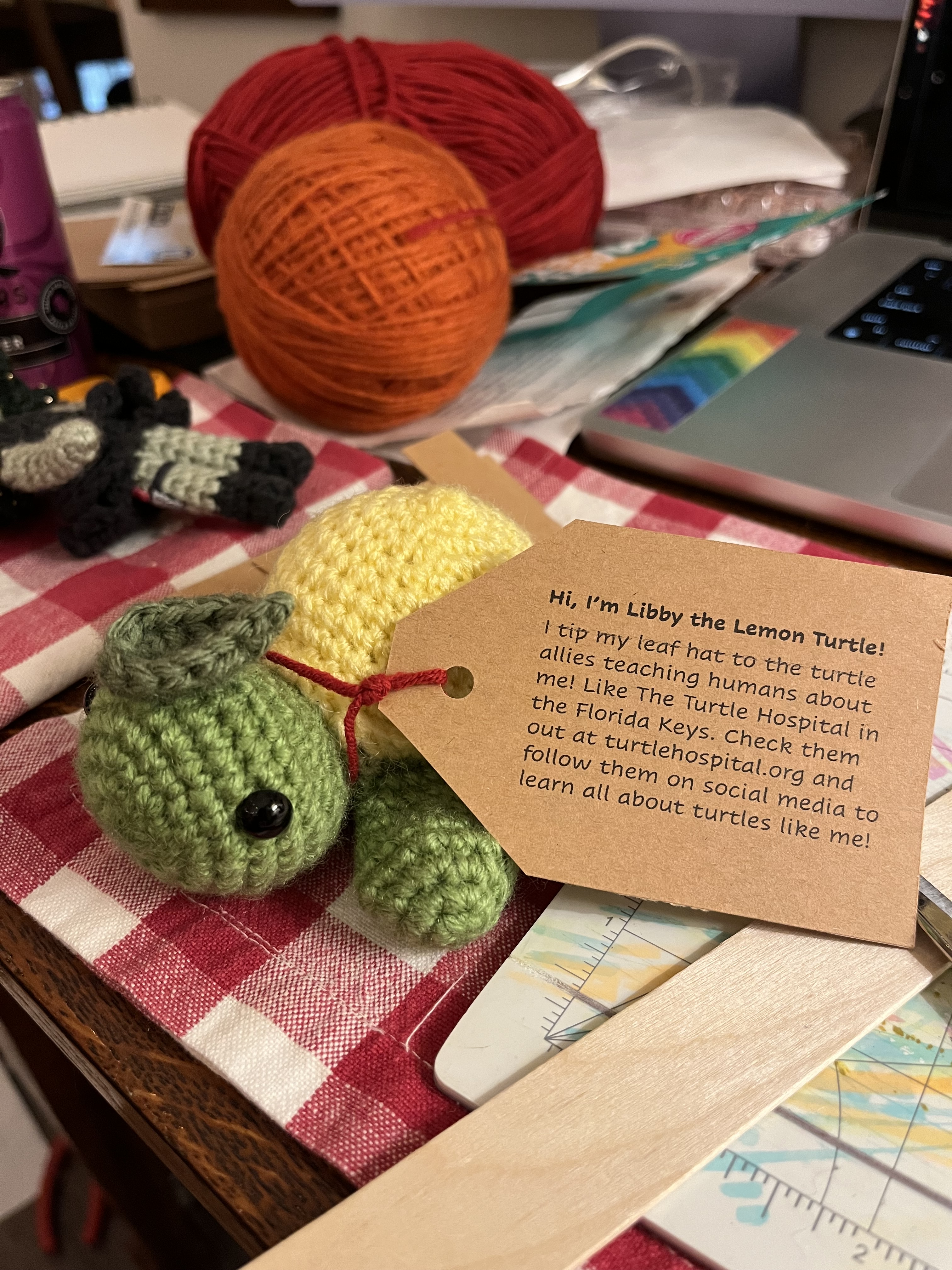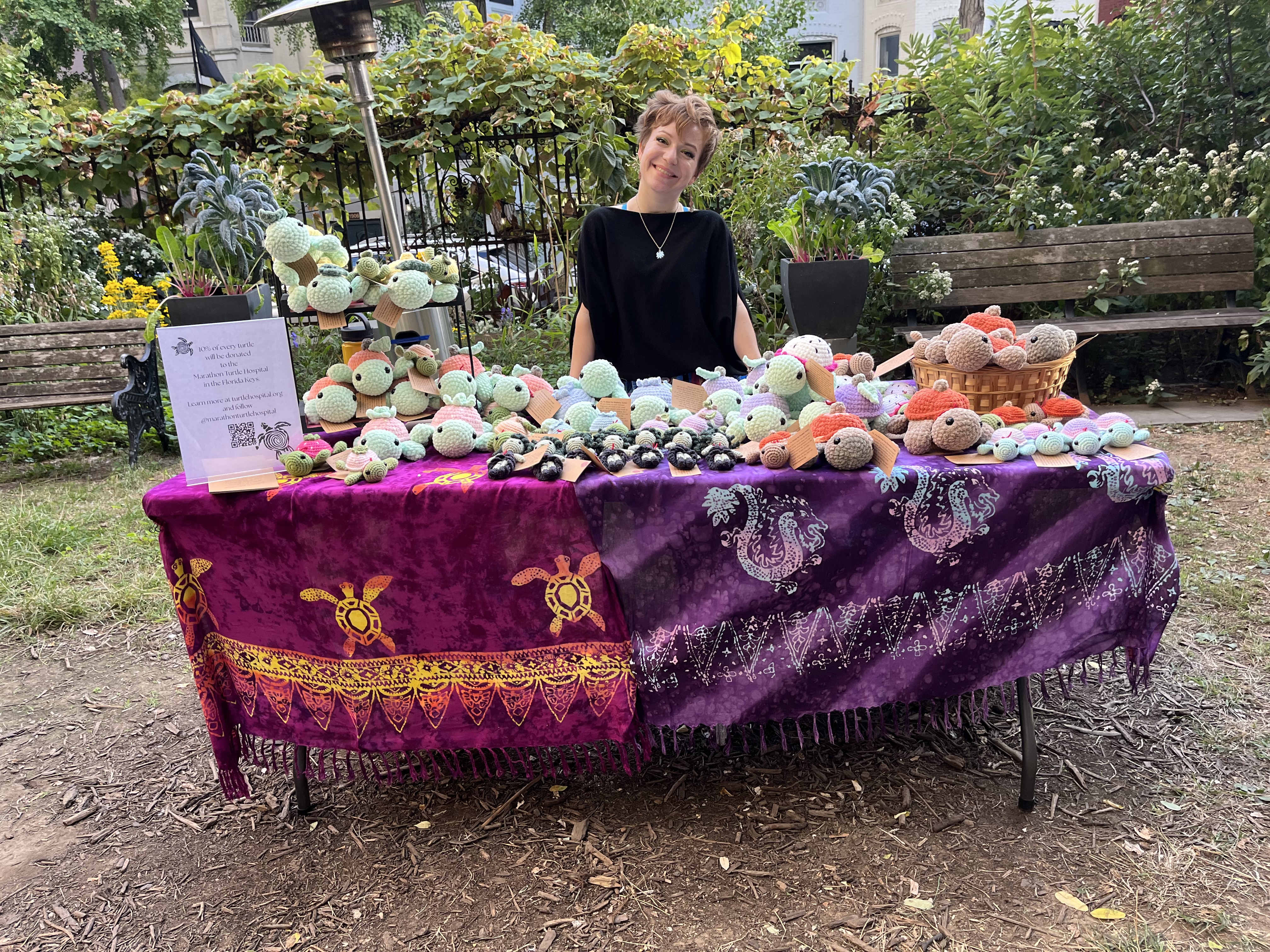 I’m autistic, and my special interest is turtles. In June I started crocheting turtles, and pretty soon I had a box full. In October I sold them for the first time at the Heurich House Mini-Markt, with 10% of each turtle’s funds going to the Turtle Hospital in the Florida Keys. I’m not affiliated with the hospital in any way, but I love keeping up with the sea turtle patients and the fantastic recovery stories the Turtle Hospital posts on their social media pages. Each crocheted turtle I sold included a fact about turtles or a nonprofit dedicated to turtle conservation, teaching customers about the ways humans can help protect endangered and threatened species.